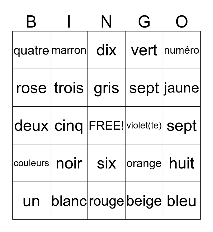 This bingo card has a free space and 25 words: noir, rouge, gris, un, numéro, quatre, rose, marron, violet(te), six, sept, deux, orange, huit, trois, neuf, sept, dix, jaune, cinq, bleu, blanc, couleurs, vert and beige.