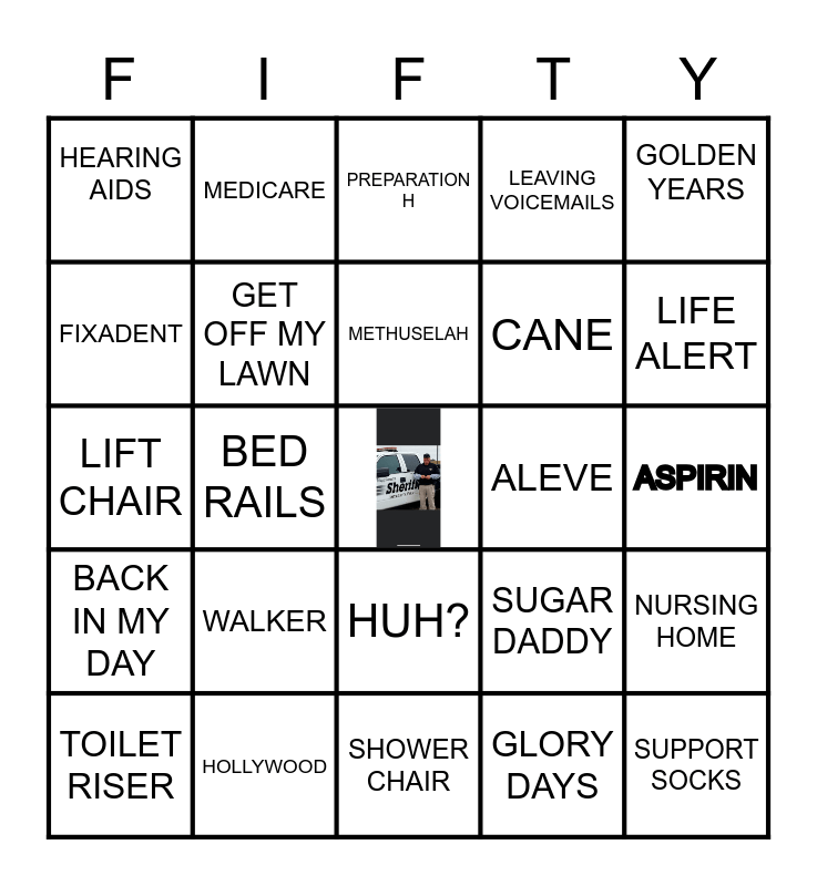 This bingo card has a free space and 37 words: 1972, AARP, ACHES, ALEVE, ASPIRIN, BACK IN MY DAY, BED RAILS, BENGAY, CANE, DEPENDS, FIXADENT, GET OFF MY LAWN, GLORY DAYS, GOLDEN YEARS, HEARING AIDS, HOLLYWOOD, HUH?, LEAVING VOICEMAILS, LIFE ALERT, LIFT CHAIR, MEDICARE, METHUSELAH, MOTHBALLS, NURSING HOME, OLD AS MOLD, OLD SPICE, PREPARATION H, RIPE, ROLAIDS, RUSTY, SENIOR DISCOUNT, SHOWER CHAIR, SUGAR DADDY, SUPPORT SOCKS, TOILET RISER, WALKER and WHITE NEW BALANCE.