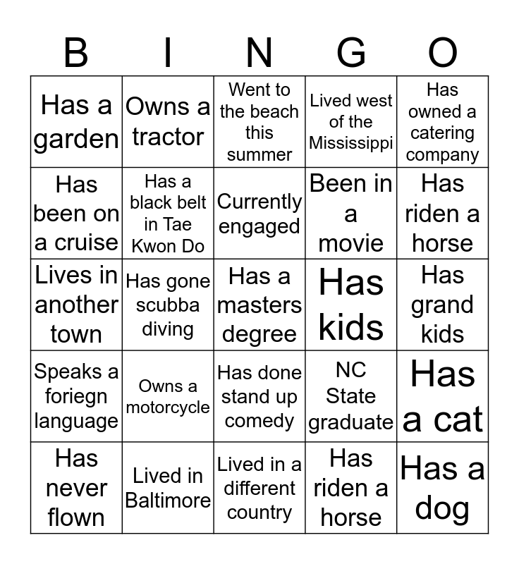 This bingo card has 25 words: Owns a motorcycle, Lived in a different country, Currently engaged, Has never flown, Has owned a catering company, Has a garden, Has been on a cruise, Owns a tractor, Has kids, Has done stand up comedy, Been in a movie, Lives in another town, NC State graduate, Has a cat, Has a black belt in Tae Kwon Do, Has a dog, Has grand kids, Went to the beach this summer, Has riden a horse, Has gone scubba diving, Has a masters degree, Lived in Baltimore, Speaks a foriegn language, Lived west of the Mississippi and Has riden a horse.