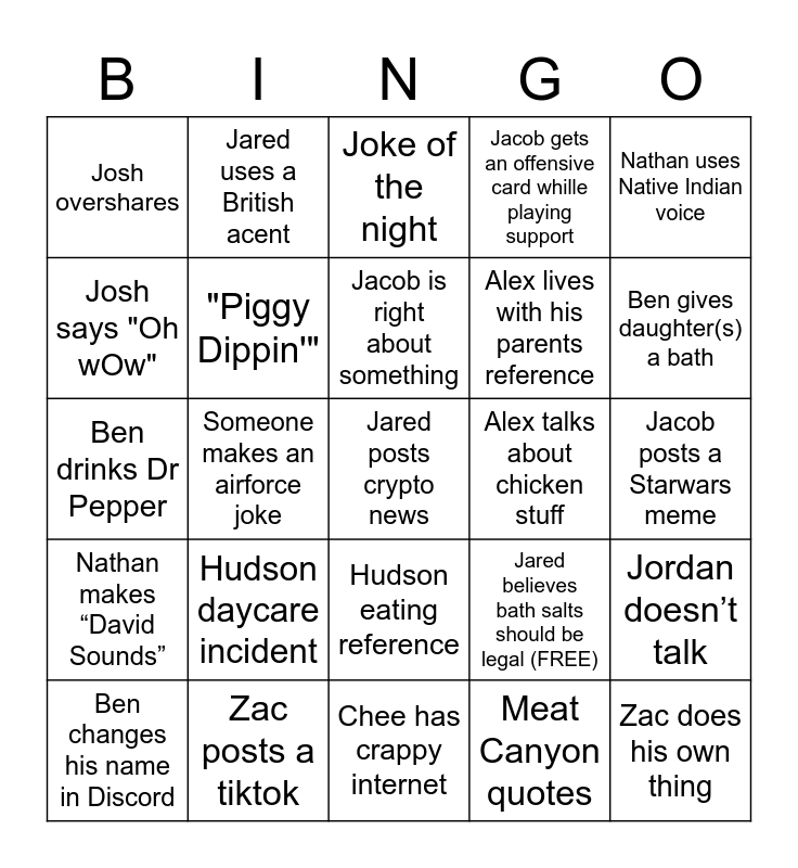 This bingo card has 25 words: Hudson daycare incident, Chee has crappy internet, Jacob is right about something, Ben changes his name in Discord, Nathan uses Native Indian voice, Josh overshares, Josh says "Oh wOw", Jared uses a British acent, Alex talks about chicken stuff, Hudson eating reference, Alex lives with his parents reference, Ben drinks Dr Pepper, Jared believes bath salts should be legal (FREE), Jordan doesn’t talk, "Piggy Dippin'", Zac does his own thing, Jacob posts a Starwars meme, Joke of the night, Ben gives daughter(s) a bath, Someone makes an airforce joke, Jared posts crypto news, Zac posts a tiktok, Nathan makes “David Sounds”, Jacob gets an offensive card whille playing support and Meat Canyon quotes.