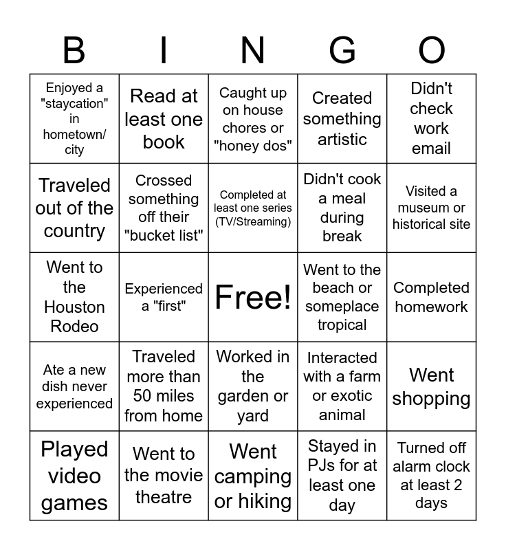 This bingo card has a free space and 24 words: Traveled more than 50 miles from home, Went to the movie theatre, Completed at least one series (TV/Streaming), Played video games, Didn't check work email, Enjoyed a "staycation" in hometown/ city, Traveled out of the country, Read at least one book, Went to the beach or someplace tropical, Worked in the garden or yard, Didn't cook a meal during break, Went to the Houston Rodeo, Interacted with a farm or exotic animal, Went shopping, Crossed something off their "bucket list", Stayed in PJs for at least one day, Completed homework, Caught up on house chores or "honey dos", Visited a museum or historical site, Experienced a "first", Turned off alarm clock at least 2 days, Ate a new dish never experienced, Created something artistic and Went camping or hiking.