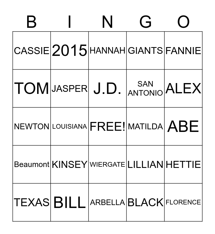 This bingo card has a free space and 24 words: KINSEY, BILL, J.D., TEXAS, FANNIE, CASSIE, TOM, 2015, MATILDA, WIERGATE, SAN ANTONIO, NEWTON, LILLIAN, HETTIE, JASPER, BLACK, ABE, HANNAH, ALEX, LOUISIANA, FLORENCE, Beaumont, GIANTS and ARBELLA.