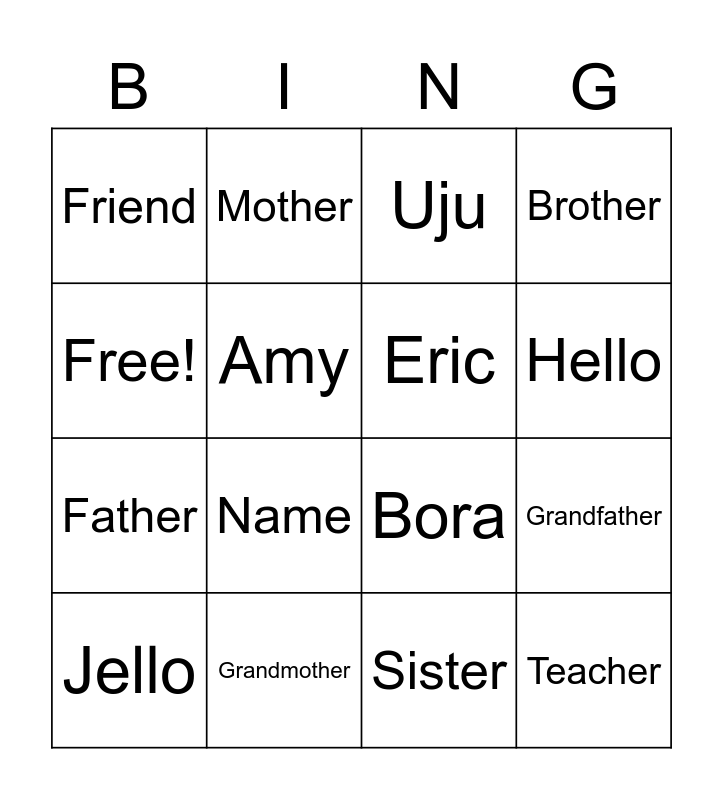 This bingo card has 16 words: Grandmother, Grandfather, Uju, Friend, Father, Mother, Bora, Sister, Free!, Amy, Jello, Brother, Name, Hello, Eric and Teacher.