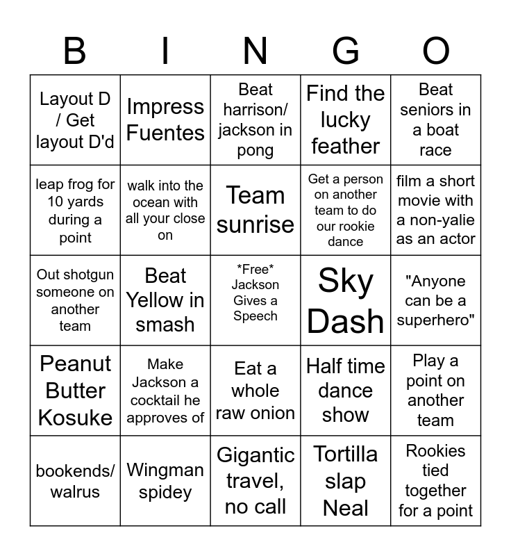 This bingo card has a free space and 24 words: Make Jackson a cocktail he approves of, Wingman spidey, Team sunrise, bookends/ walrus, Beat seniors in a boat race, Layout D / Get layout D'd, leap frog for 10 yards during a point, Impress Fuentes, Sky Dash, Eat a whole raw onion, Get a person on another team to do our rookie dance, Out shotgun someone on another team, Half time dance show, Play a point on another team, walk into the ocean with all your close on, Tortilla slap Neal, "Anyone can be a superhero", Beat harrison/ jackson in pong, film a short movie with a non-yalie as an actor, Beat Yellow in smash, Rookies tied together for a point, Peanut Butter Kosuke, Find the lucky feather and Gigantic travel, no call.
