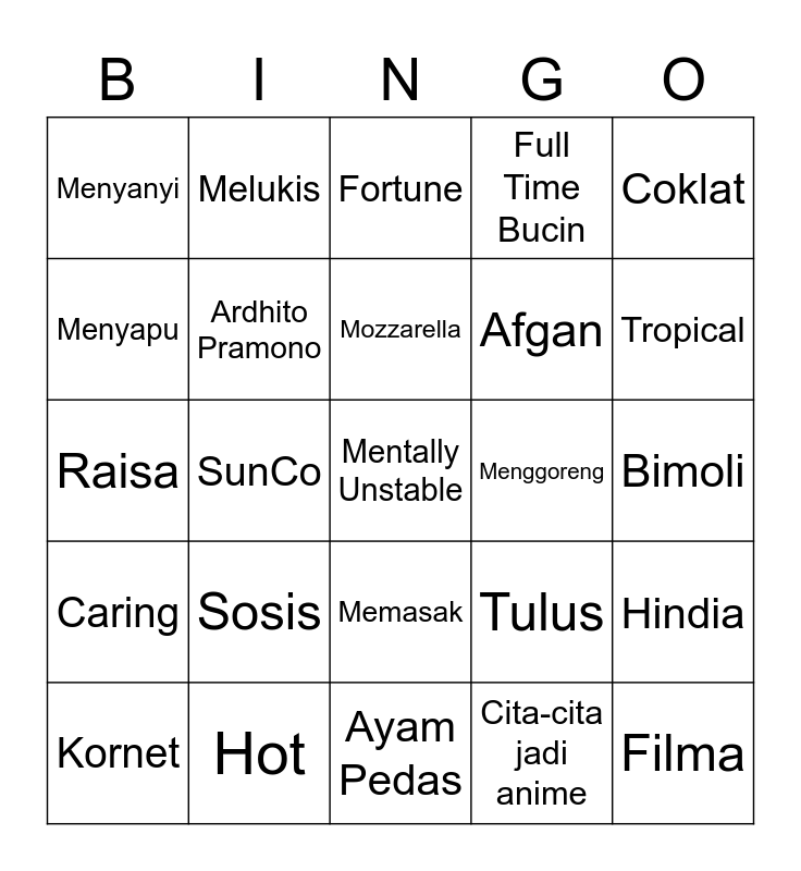 This bingo card has 25 words: Sosis, Ayam Pedas, Mozzarella, Kornet, Coklat, Menyanyi, Menyapu, Melukis, Menggoreng, Memasak, Afgan, Raisa, Tulus, Hindia, Ardhito Pramono, Filma, Bimoli, Fortune, Tropical, SunCo, Mentally Unstable, Hot, Caring, Full Time Bucin and Cita-cita jadi anime.