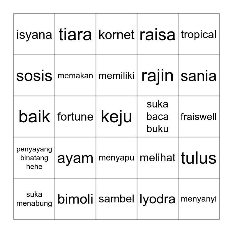 This bingo card has a free space and 24 words: ayam, bimoli, memiliki, suka menabung, tropical, isyana, sosis, tiara, suka baca buku, menyapu, rajin, baik, melihat, tulus, memakan, lyodra, fraiswell, kornet, sania, fortune, menyanyi, penyayang binatang hehe, raisa and sambel.