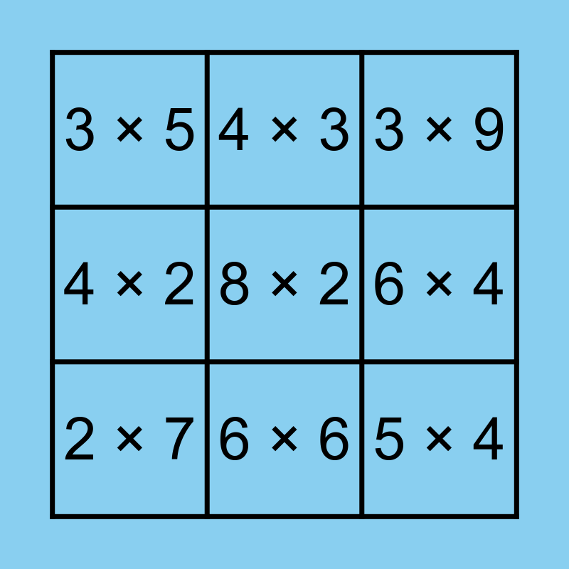 This bingo card has a free space and 8 words: 6 × 4, 3 × 9, 4 × 3, 2 × 7, 3 × 5, 5 × 4, 4 × 2 and 6 × 6.