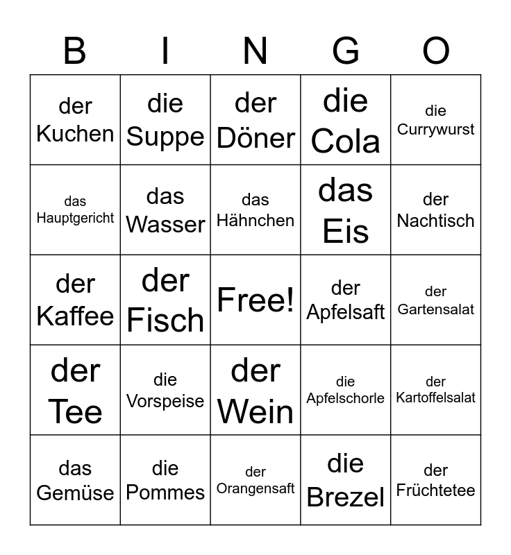 This bingo card has a free space and 24 words: die Vorspeise, die Pommes, das Hähnchen, das Gemüse, die Currywurst, der Kuchen, das Hauptgericht, die Suppe, der Apfelsaft, der Wein, das Eis, der Kaffee, die Apfelschorle, der Kartoffelsalat, das Wasser, die Brezel, der Gartensalat, der Döner, der Nachtisch, der Fisch, der Früchtetee, der Tee, die Cola and der Orangensaft.