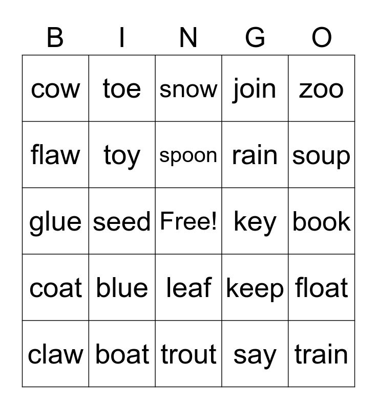 This bingo card has a free space and 24 words: blue, boat, spoon, claw, zoo, cow, flaw, toe, key, leaf, rain, glue, keep, float, toy, say, book, snow, soup, seed, train, coat, join and trout.