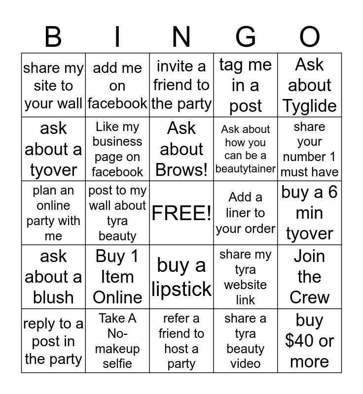 This bingo card has a free space and 24 words: Buy 1 Item Online, Take A No-makeup selfie, Ask about Brows!, reply to a post in the party, Ask about Tyglide, share my site to your wall, ask about a tyover, add me on facebook, Add a liner to your order, buy a lipstick, Ask about how you can be a beautytainer, plan an online party with me, share my tyra website link, Join the Crew, Like my business page on facebook, share a tyra beauty video, buy a 6 min tyover, invite a friend to the party, share your number 1 must have, post to my wall about tyra beauty, buy $40 or more, ask about a blush, tag me in a post and refer a friend to host a party.
