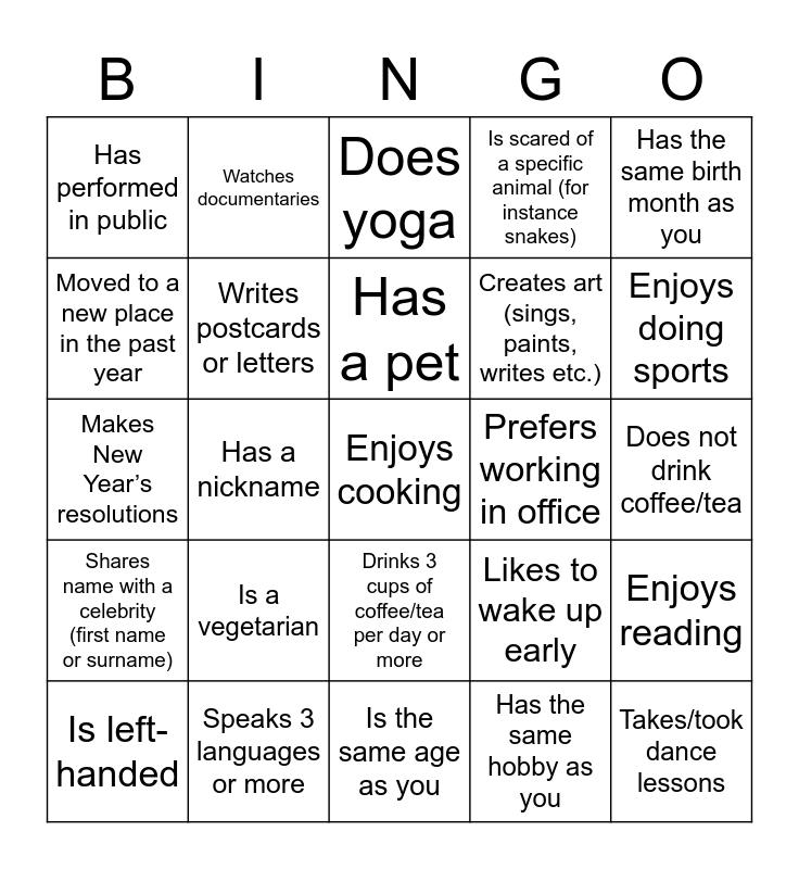 This bingo card has a free space and 24 words: Is a vegetarian, Speaks 3 languages or more, Has a pet, Is left-handed, Has the same birth month as you, Has performed in public, Moved to a new place in the past year, Watches documentaries, Prefers working in office, Drinks 3 cups of coffee/tea per day or more, Creates art (sings, paints, writes etc.), Makes New Year’s resolutions, Likes to wake up early, Enjoys reading, Writes postcards or letters, Has the same hobby as you, Does not drink coffee/tea, Does yoga, Enjoys doing sports, Has a nickname, Takes/took dance lessons, Shares name with a celebrity (first name or surname), Is scared of a specific animal (for instance snakes) and Is the same age as you.