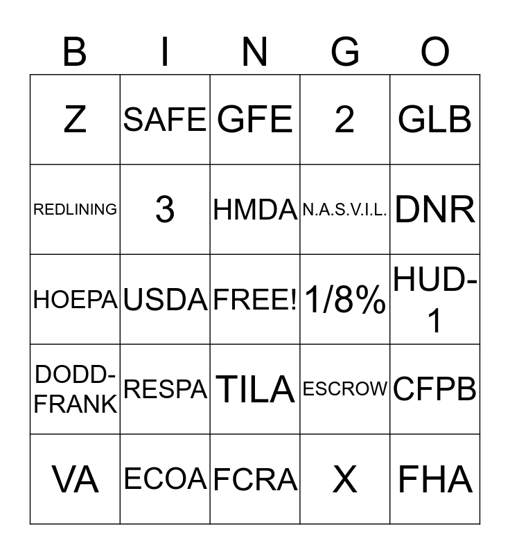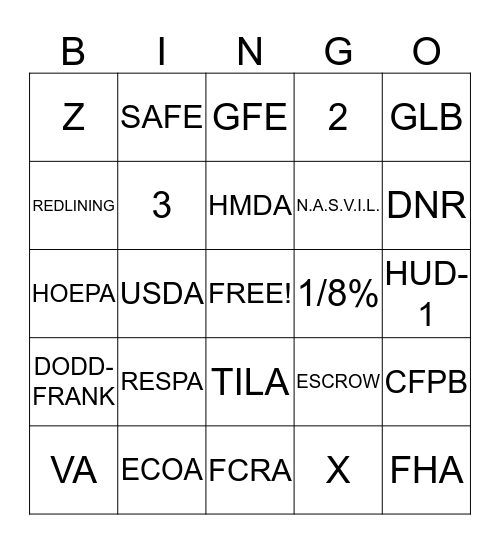 This bingo card has a free space and 24 words: RESPA, ECOA, HMDA, VA, GLB, Z, REDLINING, SAFE, 1/8%, TILA, N.A.S.V.I.L., HOEPA, ESCROW, CFPB, 3, X, HUD-1, GFE, DNR, USDA, FHA, DODD-FRANK, 2 and FCRA.