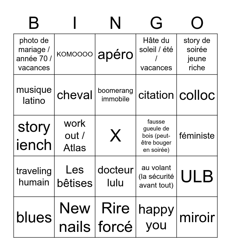 This bingo card has a free space and 24 words: Les bêtises, New nails, boomerang immobile, blues, story de soirée jeune riche, photo de mariage / année 70 / vacances, musique latino, KOMOOOO, fausse gueule de bois (peut-être bouger en soirée), docteur lulu, citation, story iench, au volant (la sécurité avant tout), ULB, cheval, happy you, féministe, apéro, colloc, work out / Atlas, miroir, traveling humain, Hâte du soleil / été / vacances and Rire forcé.