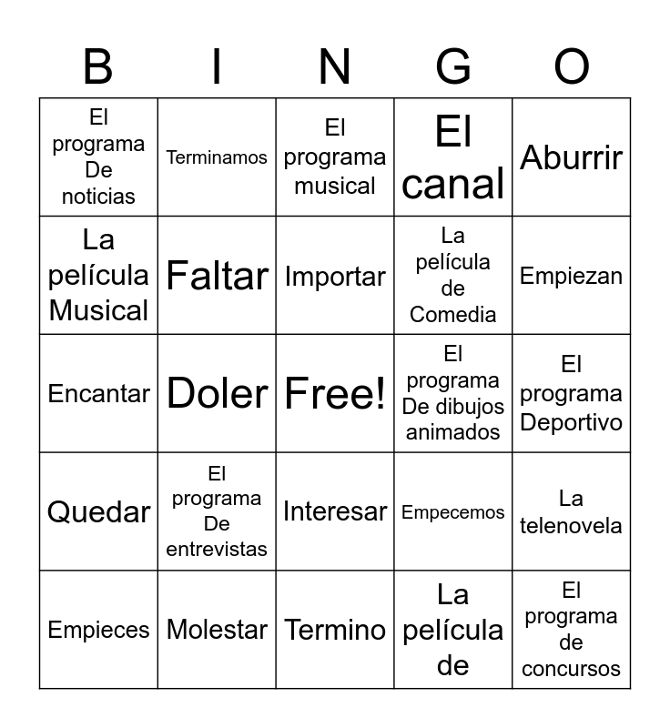 This bingo card has a free space and 40 words: Gustar, Encantar, Fascinar, Faltar, Molestar, Interesar, Importar, Repugnar, Aburrir, Quedar, Doler, El canal, El programa de concursos, El programa Deportivo, El programa De dibujos animados, El programa De entrevistas, El programa De la vida real, El programa De noticias, El programa Educativo, El programa musical, La telenovela, La película de, La película de Comedia, La película Musical, La película de Ciencia ficcion, La película de Horror, La película de Policiaca, La película Romantica, La película de Accion, La película de Drama, Empiezo, Empieces, Empiece, Empecemos, Empiezan, Termino, Terminas, Termina, Terminamos and Terminan.