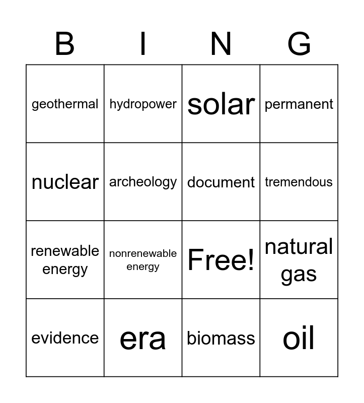 This bingo card has 19 words: Free!, coal, solar, oil, natural gas, nuclear, biomass, geothermal, hydropower, renewable energy, nonrenewable energy, archeology, document, era, evidence, expedition, permanent, tremendous and uncover.