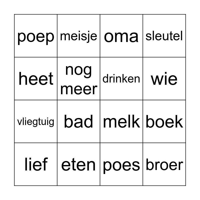 This bingo card has 47 words: spelen, lief, kapot, klaar, bal, regen, meisje, vogel, nog meer, waar, drinken, sleutel, banaan, muziek, sorry, licht aan, wie, eten, dank je wel, heet, boek, speen, poep, vliegtuig, kinder- boerderij, bad, helpen, slapen, buiten, broer, baby, auto, fiets, mama, hond, slab, poes, pop, luier, kinderen, zus, oma, melk, meegaan, papa, opa and jongen.