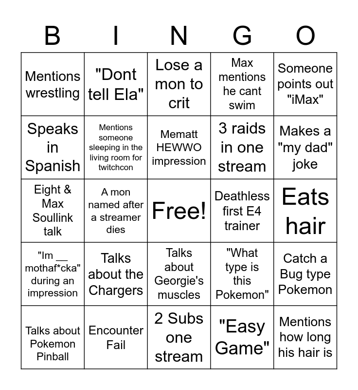 This bingo card has a free space and 24 words: Talks about the Chargers, Encounter Fail, Mematt HEWWO impression, Talks about Pokemon Pinball, Someone points out "iMax", Mentions wrestling, Speaks in Spanish, "Dont tell Ela", Deathless first E4 trainer, Talks about Georgie's muscles, 3 raids in one stream, Eight & Max Soullink talk, "What type is this Pokemon", Catch a Bug type Pokemon, Mentions someone sleeping in the living room for twitchcon, "Easy Game", Eats hair, Lose a mon to crit, Makes a "my dad" joke, A mon named after a streamer dies, Mentions how long his hair is, "Im __ mothaf*cka" during an impression, Max mentions he cant swim and 2 Subs one stream.
