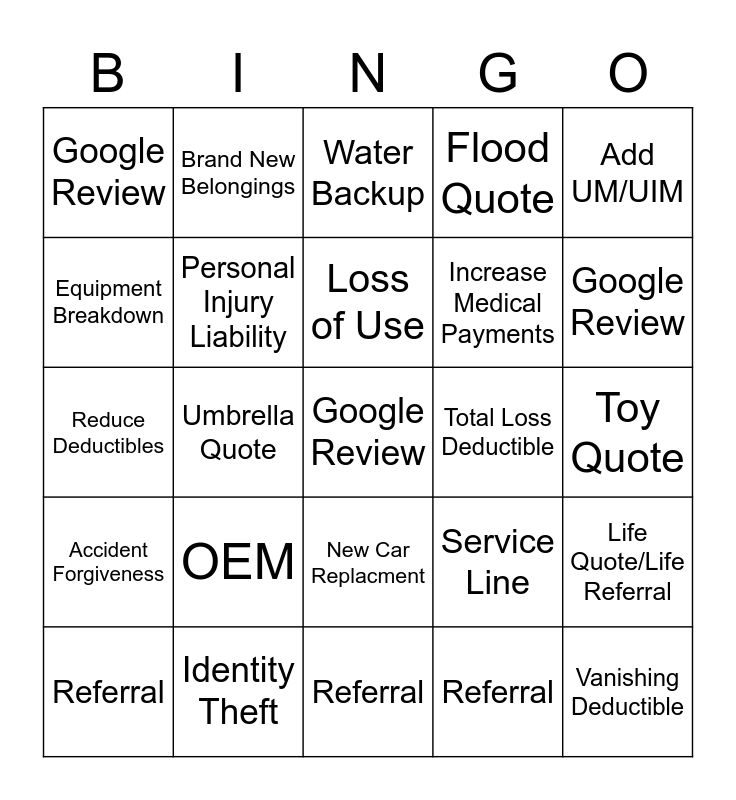 This bingo card has 25 words: Accident Forgiveness, Identity Theft, Google Review, Referral, Add UM/UIM, Google Review, Brand New Belongings, Water Backup, Total Loss Deductible, Life Quote/Life Referral, Equipment Breakdown, Personal Injury Liability, Referral, Service Line, Google Review, Referral, Umbrella Quote, Loss of Use, Increase Medical Payments, Toy Quote, Reduce Deductibles, OEM, New Car Replacment, Flood Quote and Vanishing Deductible.