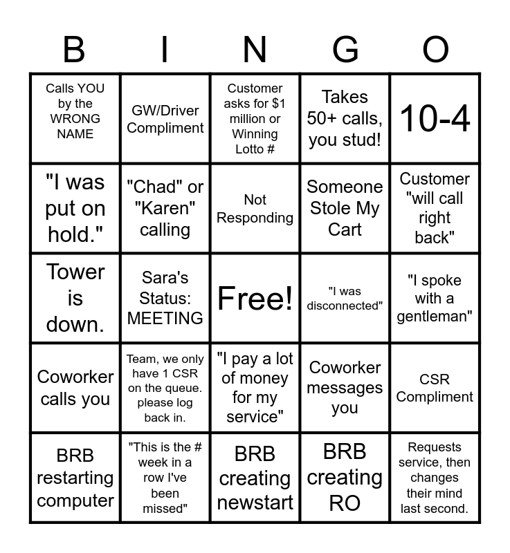 This bingo card has a free space and 24 words: Team, we only have 1 CSR on the queue. please log back in., "This is the # week in a row I've been missed", Not Responding, BRB restarting computer, 10-4, Calls YOU by the WRONG NAME, "I was put on hold.", GW/Driver Compliment, "I was disconnected", "I pay a lot of money for my service", Someone Stole My Cart, Tower is down., Coworker messages you, CSR Compliment, "Chad" or "Karen" calling, BRB creating RO, "I spoke with a gentleman", Customer asks for $1 million or Winning Lotto #, Customer "will call right back", Sara's Status: MEETING, Requests service, then changes their mind last second., Coworker calls you, Takes 50+ calls, you stud! and BRB creating newstart.
