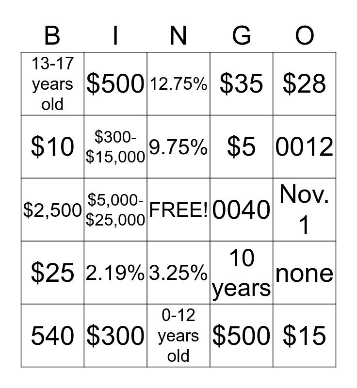 This bingo card has a free space and 24 words: 2.19%, $300, 9.75%, 540, $28, 13-17 years old, $10, $500, 0040, 3.25%, $5, $2,500, 10 years, none, $300- $15,000, $500, Nov. 1, 12.75%, 0012, $5,000- $25,000, $15, $25, $35 and 0-12 years old.