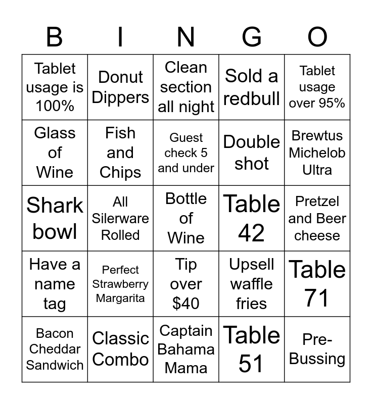 This bingo card has a free space and 24 words: Perfect Strawberry Margarita, Classic Combo, Guest check 5 and under, Bacon Cheddar Sandwich, Tablet usage over 95%, Tablet usage is 100%, Glass of Wine, Donut Dippers, Table 42, Tip over $40, Double shot, Shark bowl, Upsell waffle fries, Table 71, Fish and Chips, Table 51, Pretzel and Beer cheese, Clean section all night, Brewtus Michelob Ultra, All Silerware Rolled, Pre-Bussing, Have a name tag, Sold a redbull and Captain Bahama Mama.