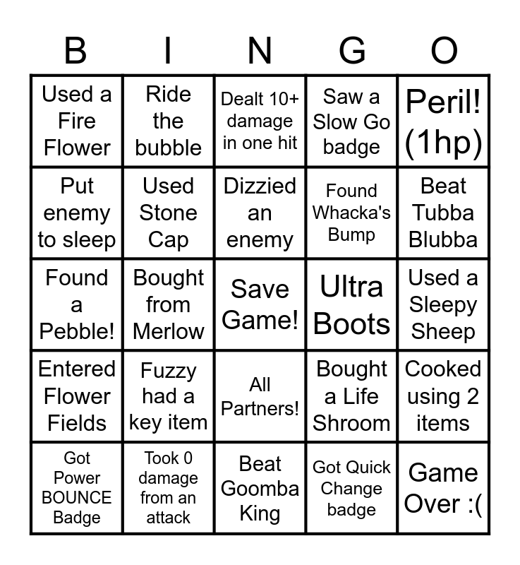 This bingo card has a free space and 43 words: Found Goombario!, Game Over :(, Got Power Plus Badge, Got Power BOUNCE Badge, Got Defend Plus Badge, Got Quick Change badge, Dealt 10+ damage in one hit, Made it QUAKE! (used quake hammer), Peril! (1hp), Took 0 damage from an attack, Saw a Slow Go badge, Ultra Boots, All Partners!, Fuzzy had a key item, Beat Crystal King, Beat Goomba King, Partner takes damage, Found a Pebble!, Have 25+ FP, Beat Tubba Blubba, Ride the bubble, 25 star pieces, Sub with Prime, Used a Fire Flower, Used a Snowman Doll, Used a Sleepy Sheep, Block a first strike, Uber Eats for Yellow Yoshi, Bought a Life Shroom, Entered Flower Fields, Pick up 5 Letters, Cooked using 2 items, Found Koopers Shell, Bought from Merlow, Have 0 coins :(, Failed to run away, Took spike/fire damage, Dizzied an enemy, Put enemy to sleep, Found Whacka's Bump, Used Bow's Outta Sight, Used Stone Cap and Partner in a tree.