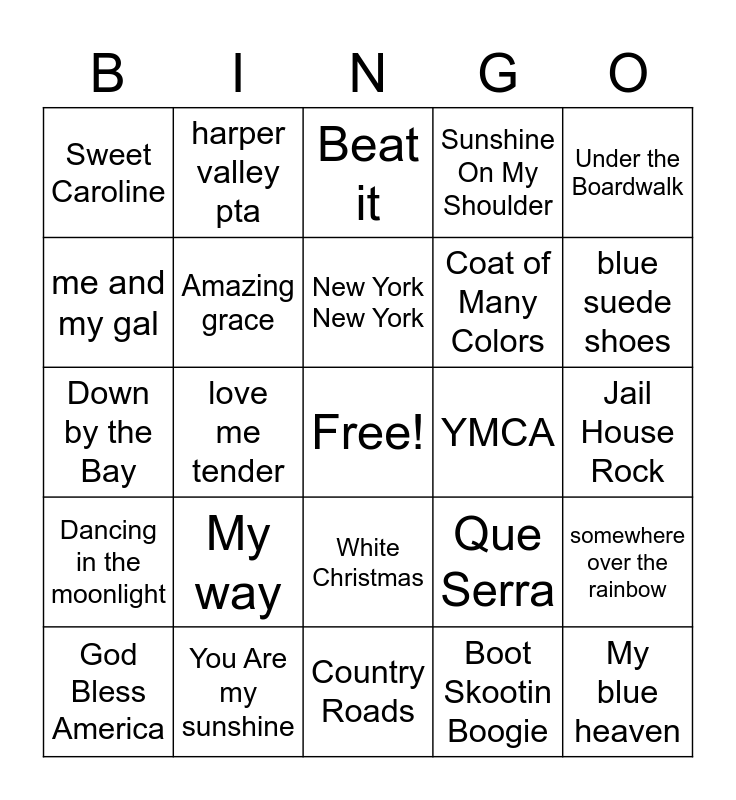 This bingo card has a free space and 24 words: My way, You Are my sunshine, New York New York, God Bless America, Under the Boardwalk, Sweet Caroline, me and my gal, harper valley pta, YMCA, White Christmas, Coat of Many Colors, Down by the Bay, Que Serra, somewhere over the rainbow, Amazing grace, Boot Skootin Boogie, Jail House Rock, Beat it, blue suede shoes, love me tender, My blue heaven, Dancing in the moonlight, Sunshine On My Shoulder and Country Roads.