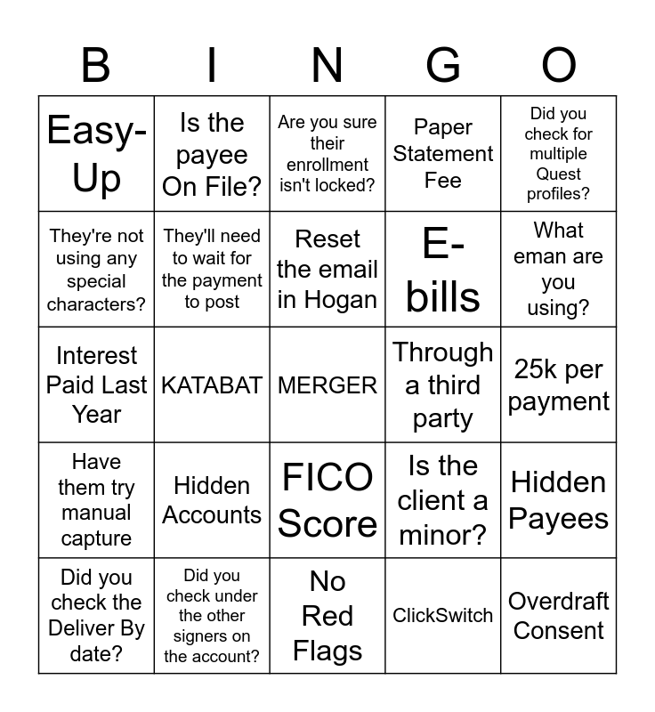 This bingo card has 35 words: Did you check the CUAC Matrix?, Balance Transfer, Display Settings, They'll need to wait for the payment to post, FICO Score, Paper Statement Fee, They're not using any special characters?, CSV Format, Reset the email in Hogan, Did you do a mock enrollment?, Interest Paid Last Year, Did you check for multiple Quest profiles?, Check for restrictions, Disabled status, Easy-Up, Through a third party, ClickSwitch, KATABAT, Have them try manual capture, MERGER, Is the client a minor?, Did you check the Deliver By date?, Hidden Payees, Did you check under the other signers on the account?, Are you sure their enrollment isn't locked?, What eman are you using?, Overdraft Consent, You can offer an LOI, E-bills, 25k per payment, Up to 7 years, No Red Flags, Hidden Accounts, Is the payee On File? and On Us Payee.