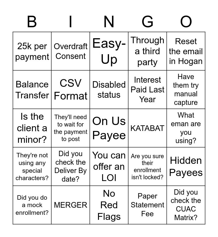 This bingo card has 33 words: Did you check the CUAC Matrix?, Display Settings, They'll need to wait for the payment to post, FICO Score, They're not using any special characters?, CSV Format, Reset the email in Hogan, Did you do a mock enrollment?, Overdraft Consent, Did you check under the other signers on the account?, Disabled status, Easy-Up, E-bills, ClickSwitch, KATABAT, Have them try manual capture, MERGER, Is the client a minor?, Did you check the Deliver By date?, Are you sure their enrollment isn't locked?, You can offer an LOI, Balance Transfer, 25k per payment, What eman are you using?, No Red Flags, On Us Payee, Through a third party, Interest Paid Last Year, Balance Transfer, Hidden Payees, Up to 7 years, Paper Statement Fee and Hidden Accounts.