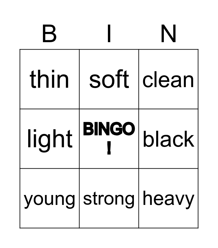 This bingo card has a free space and 39 words: slow, fast, old, young, tall, short, strong, weak, heavy, light, dark, light, old, new, long, short, fat, thin, difficult, easy, black, round, straight, narrow, large, salty, expensive, cheap, hard, soft, colorful, sour, clean, dirty, five, brave, wide, hardworking and lazy.