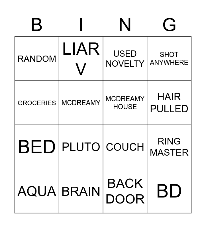 This bingo card has 16 words: BRAIN, RING MASTER, USED NOVELTY, RANDOM, BED, LIAR V, COUCH, BACK DOOR, GROCERIES, MCDREAMY, AQUA, SHOT ANYWHERE, PLUTO, HAIR PULLED, MCDREAMY HOUSE and BD.