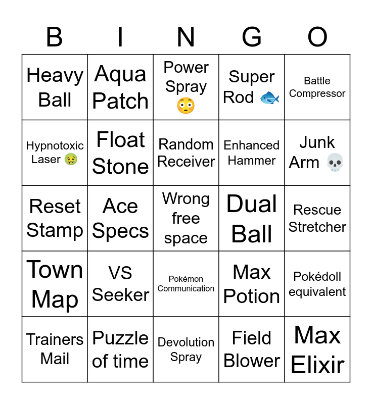 This bingo card has a free space and 24 words: VS Seeker, Puzzle of time, Random Receiver, Trainers Mail, Battle Compressor, Heavy Ball, Hypnotoxic Laser 🤢, Aqua Patch, Dual Ball, Pokémon Communication, Enhanced Hammer, Reset Stamp, Max Potion, Pokédoll equivalent, Float Stone, Field Blower, Rescue Stretcher, Power Spray 😳, Junk Arm 💀, Ace Specs, Max Elixir, Town Map, Super Rod 🐟 and Devolution Spray.