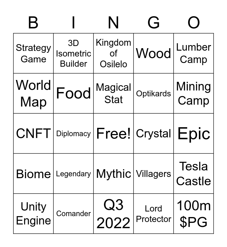 This bingo card has a free space and 24 words: Legendary, Comander, Magical Stat, Unity Engine, Lumber Camp, Strategy Game, World Map, 3D Isometric Builder, Crystal, Mythic, Optikards, CNFT, Villagers, Tesla Castle, Food, Lord Protector, Epic, Kingdom of Osilelo, Mining Camp, Diplomacy, 100m $PG, Biome, Wood and Q3 2022.