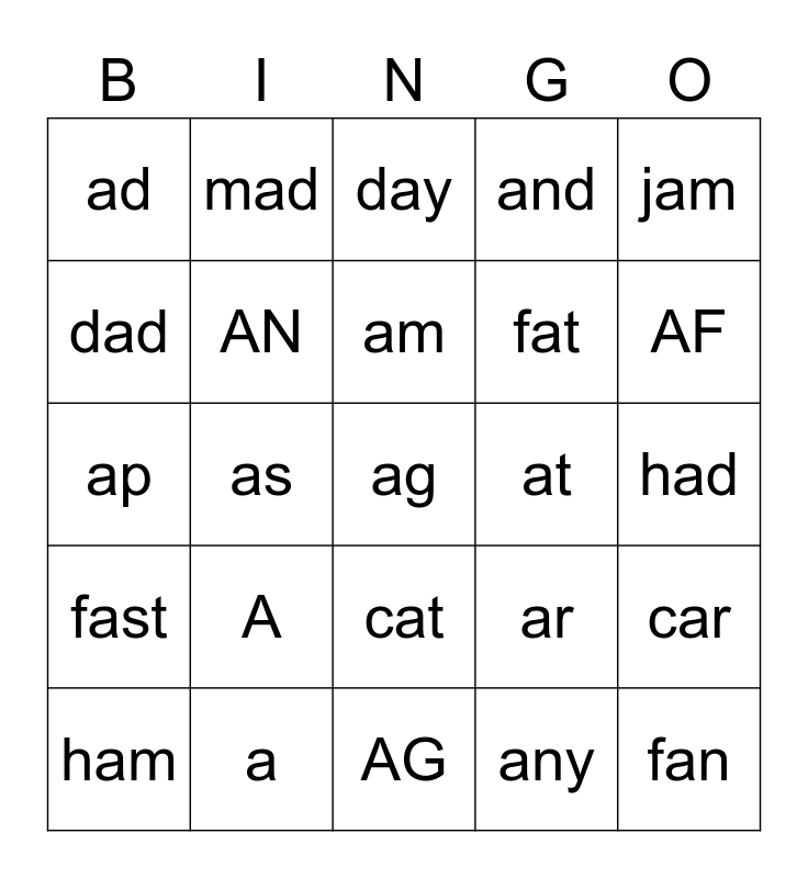 This bingo card has a free space and 24 words: A, a, am, ham, jam, ad, dad, mad, at, cat, fat, ap, ar, car, AN, any, had, day, AF, as, fan, fast, and and AG.