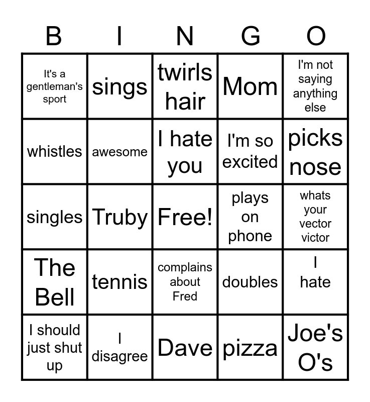 This bingo card has a free space and 24 words: tennis, I disagree, I hate you, I should just shut up, I'm not saying anything else, It's a gentleman's sport, whistles, sings, plays on phone, complains about Fred, I'm so excited, singles, doubles, I hate, awesome, pizza, whats your vector victor, twirls hair, picks nose, Truby, Joe's O's, The Bell, Mom and Dave.