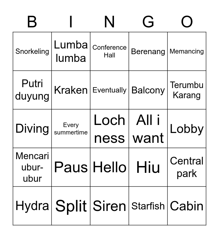 This bingo card has a free space and 24 words: Paus, Split, Eventually, Hydra, Memancing, Snorkeling, Putri duyung, Lumba lumba, All i want, Hello, Balcony, Diving, Hiu, Central park, Kraken, Starfish, Lobby, Conference Hall, Terumbu Karang, Every summertime, Cabin, Mencari ubur-ubur, Berenang and Siren.