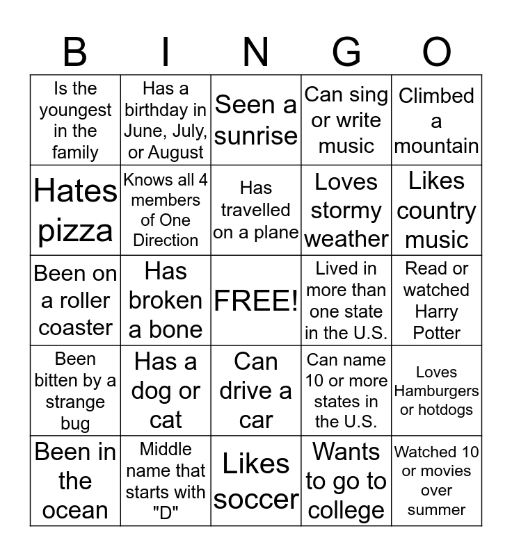 This bingo card has a free space and 24 words: Has a dog or cat, Middle name that starts with "D", Has travelled on a plane, Been in the ocean, Climbed a mountain, Is the youngest in the family, Hates pizza, Has a birthday in June, July, or August, Lived in more than one state in the U.S., Can drive a car, Loves stormy weather, Been on a roller coaster, Can name 10 or more states in the U.S., Loves Hamburgers or hotdogs, Knows all 4 members of One Direction, Wants to go to college, Read or watched Harry Potter, Seen a sunrise, Likes country music, Has broken a bone, Watched 10 or movies over summer, Been bitten by a strange bug, Can sing or write music and Likes soccer.