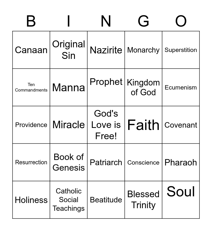 This bingo card has a free space and 24 words: Book of Genesis, Catholic Social Teachings, Prophet, Holiness, Superstition, Canaan, Ten Commandments, Original Sin, Faith, Patriarch, Kingdom of God, Providence, Conscience, Pharaoh, Manna, Blessed Trinity, Covenant, Nazirite, Ecumenism, Miracle, Soul, Resurrection, Monarchy and Beatitude.