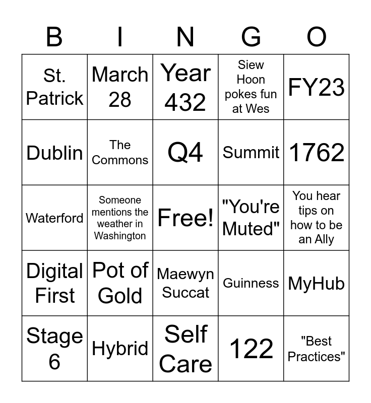 This bingo card has a free space and 24 words: Pot of Gold, Hybrid, Q4, Stage 6, FY23, St. Patrick, Dublin, March 28, "You're Muted", Maewyn Succat, Summit, Waterford, Guinness, MyHub, The Commons, 122, You hear tips on how to be an Ally, Year 432, 1762, Someone mentions the weather in Washington, "Best Practices", Digital First, Siew Hoon pokes fun at Wes and Self Care.