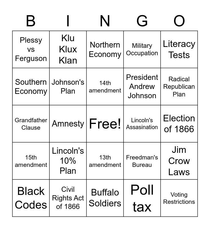 This bingo card has a free space and 24 words: Lincoln's 10% Plan, Civil Rights Act of 1866, 14th amendment, Black Codes, Literacy Tests, Plessy vs Ferguson, Southern Economy, Klu Klux Klan, Lincoln's Assasination, 13th amendment, President Andrew Johnson, Grandfather Clause, Freedman's Bureau, Jim Crow Laws, Johnson's Plan, Poll tax, Election of 1866, Northern Economy, Radical Republican Plan, Amnesty, Voting Restrictions, 15th amendment, Military Occupation and Buffalo Soldiers.