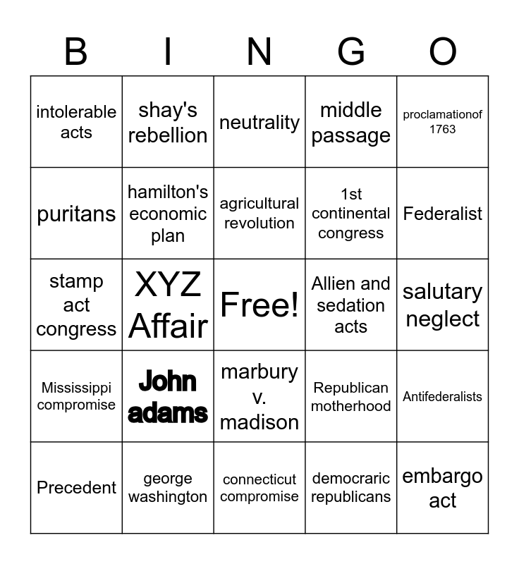 This bingo card has a free space and 24 words: John adams, george washington, agricultural revolution, Precedent, proclamationof 1763, intolerable acts, puritans, shay's rebellion, Allien and sedation acts, marbury v. madison, 1st continental congress, stamp act congress, Republican motherhood, Antifederalists, hamilton's economic plan, democraric republicans, salutary neglect, neutrality, Federalist, XYZ Affair, embargo act, Mississippi compromise, middle passage and connecticut compromise.