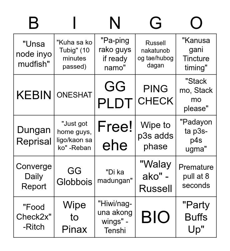 This bingo card has a free space and 24 words: GG Globbois, Wipe to Pinax, GG PLDT, "Food Check2x" -Ritch, "Kanusa gani Tincture timing", "Unsa node inyo mudfish", KEBIN, "Kuha sa ko Tubig" (10 minutes passed), Wipe to p3s adds phase, "Di ka madungan", PING CHECK, Dungan Reprisal, "Walay ako" -Russell, Premature pull at 8 seconds, ONESHAT, BIO, "Padayon ta p3s-p4s ugma", "Pa-ping rako guys if ready namo", "Stack mo, Stack mo please", "Just got home guys, ligo/kaon sa ko" -Reban, "Party Buffs Up", Converge Daily Report, Russell nakatunob og tae/hubog dagan and "Hiwi/nag-una akong wings" -Tenshi.