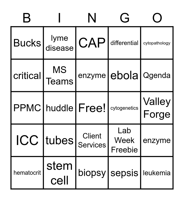 This bingo card has a free space and 24 words: tubes, stem cell, enzyme, hematocrit, cytopathology, Bucks, critical, lyme disease, cytogenetics, Client Services, ebola, PPMC, Lab Week Freebie, enzyme, MS Teams, sepsis, Valley Forge, CAP, Qgenda, huddle, leukemia, ICC, differential and biopsy.