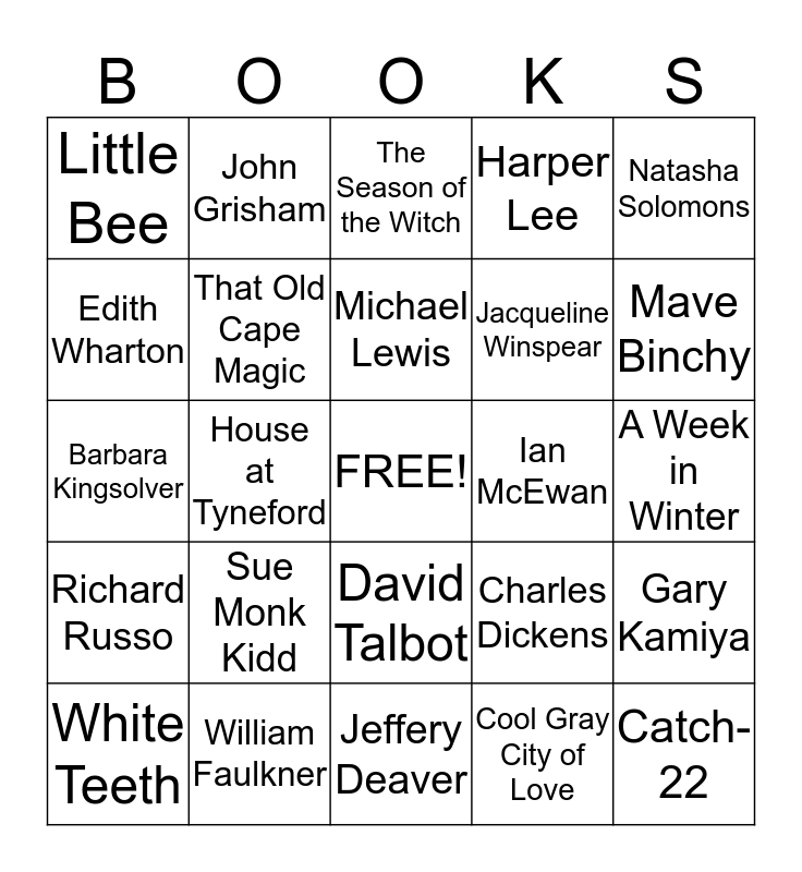 This bingo card has a free space and 42 words: Boomerang, Michael Lewis, Invention of Wings, Sue Monk Kidd, Cool Gray City of Love, Gary Kamiya, Catch-22, Joseph Heller, The Season of the Witch, David Talbot, A Week in Winter, Mave Binchy, House at Tyneford, Natasha Solomons, Bleak House, Charles Dickens, Flight Behavior, Barbara Kingsolver, Sycamore Row, John Grisham, Edith Wharton, The Age of Innocence, Chris Cleave, Little Bee, John Irving, Last Night in Twisted River, Jacqueline Winspear, Candace Bushnell, James McBride, The Color of Water, J.K. Rowling, Richard Russo, That Old Cape Magic, Jeffery Deaver, Zadie Smith, White Teeth, William Faulkner, Ian McEwan, The Little Prince, Go Set a Watchman, Harper Lee and Millbrae: A Place in the Sun.
