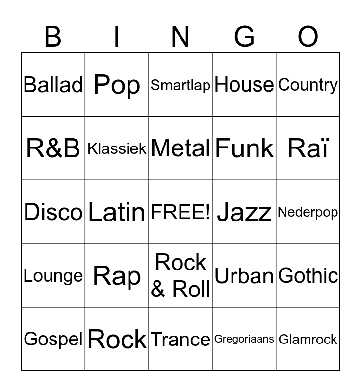 This bingo card has a free space and 24 words: Rap, Rock, Metal, Gospel, Country, Ballad, R&B, Pop, Jazz, Rock & Roll, Funk, Disco, Urban, Gothic, Klassiek, Gregoriaans, Nederpop, Smartlap, Raï, Latin, Glamrock, Lounge, House and Trance.