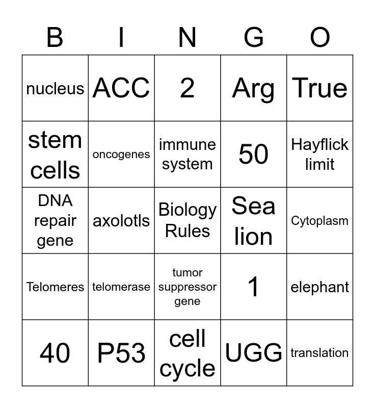This bingo card has a free space and 33 words: Tasmanian Devil, False, axolotls, transcription, Telomeres, oncogenes, True, 40, ACC, Mutation, immune system, 2, Replication, genes, Sea lion, Hayflick limit, P53, DNA repair gene, telomerase, 1, tumor suppressor gene, contact inhibition, nucleus, Cytoplasm, cell cycle, translation, Arg, 50, stem cells, elephant, naked mole rat, UGG and Met.