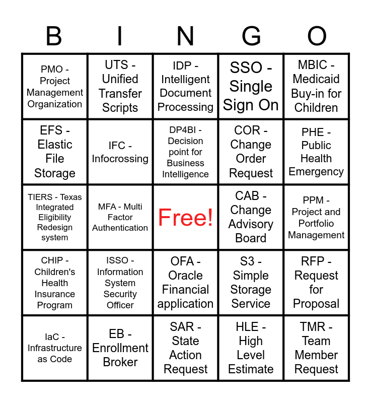 This bingo card has a free space and 41 words: HHSC - Health and Human Services Commission, TIERS - Texas Integrated Eligibility Redesign system, CMS - Center for Medicare and Medicaid Services, IFC - Infocrossing, EB - Enrollment Broker, OFA - Oracle Financial application, DP4BI - Decision point for Business Intelligence, SSP - Self service portal, MBIC - Medicaid Buy-in for Children, CHIP - Children's Health Insurance Program, MFA - Multi Factor Authentication, SSO - Single Sign On, TMR - Team Member Request, PPM - Project and Portfolio Management, CAB - Change Advisory Board, ISSO - Information System Security Officer, CCOE - Cloud Center Of Excellence, PMO - Project Management Organization, CSR - Call Center Reps, IDP - Intelligent Document Processing, RFP - Request for Proposal, MIM - Maximus Initiated Memorandum, SAR - State Action Request, COR - Change Order Request, IAR - Impact Assessment Report, KPR - Key Performance Requirement, HLE - High Level Estimate, LOE - Level Of Effort, PHE - Public Health Emergency, JIP - Joint Interface Plan, PSR - Production Support Request, UTS - Unified Transfer Scripts, IaC - Infrastructure as Code, CICD - Continuous Integration and Continuous Deployment, S3 - Simple Storage Service, EFS - Elastic File Storage, EBS - Elastic Block Storage, EC2 - Elastic Compute Cloud, IAST - Interactive Application Security Testing, NSOC - Network Security Operations Center and WAN - Wide Area Network.