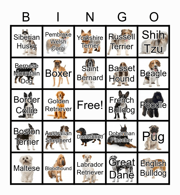 This bingo card has 31 images, a free space and 31 words: Labrador Retriever, German Shepherd, Golden Retriever, Miniature Schnauzer, Siberian Husky, Yorkshire Terrier, Boxer, Doberman Pinscher, French Bulldog, Great Dane, Poodle, English Bulldog, Chihuahua, Pomeranian, Beagle, Rottweiler, Pug, Australian Shepherd, Boston Terrier, Dachshund, Shih Tzu, English Mastiff, Maltese, Pembroke Welsh Corgi, Basset Hound, Bernese Mountain Dog, Russell Terrier, Border Collie, Bloodhound, Saint Bernard and Shiba Inu.