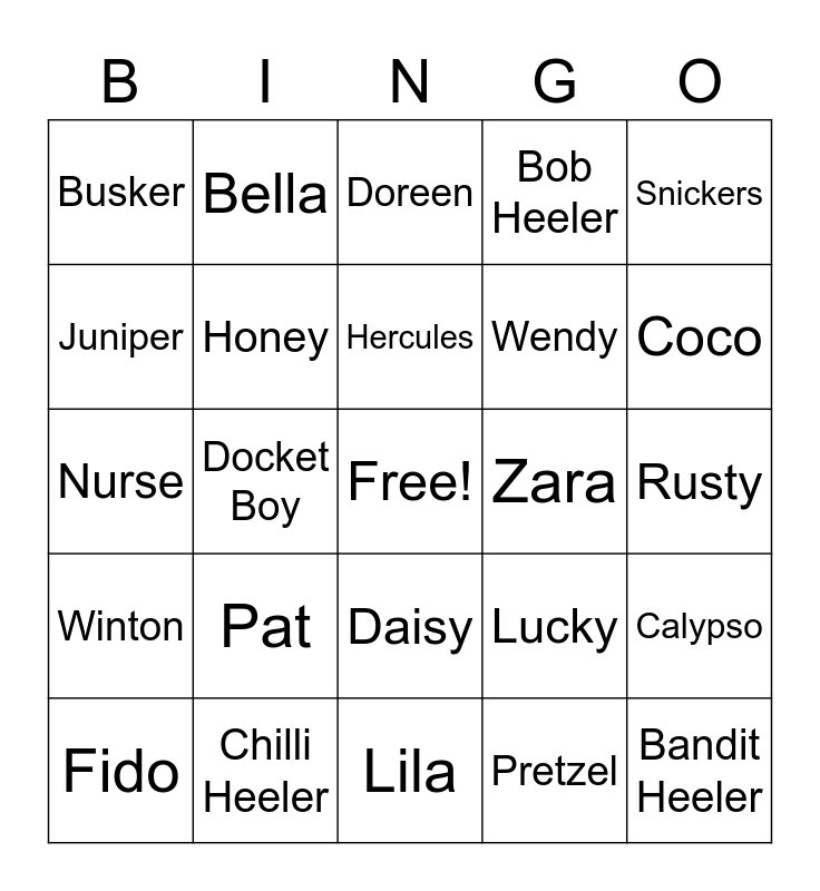 This bingo card has a free space and 49 words: Chloe, Bandit Heeler, Bentley, Lila, Pat, Marcus, Bella, Winnie, Juniper, Alfie, Honey, Bob Heeler, Calypso, Lucky, Judo, Maynard, Hercules, Zara, Postie, Snickers, Docket Boy, Pretzel, Busker, Wendy, Sadie, Coco, Fido, Chunky Chimp, Daisy, Winton, Rodney, Buddy, Bingo Heeler, Mia, Chilli Heeler, Harley, Surfer, Captain, Rusty, Gruber, Rocko, Bluey Heeler, Missy, Chris Heeler, Nurse, Doreen, Mackenzie, Indy and Frisky.