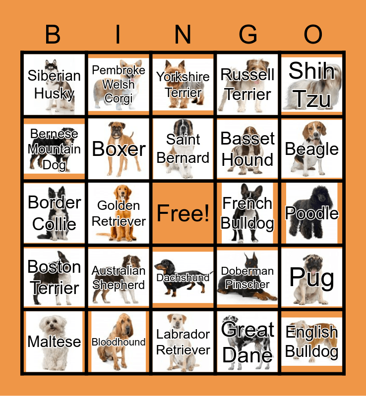 This bingo card has 31 images, a free space and 31 words: Labrador Retriever, German Shepherd, Golden Retriever, Miniature Schnauzer, Siberian Husky, Yorkshire Terrier, Boxer, Doberman Pinscher, French Bulldog, Great Dane, Poodle, English Bulldog, Chihuahua, Pomeranian, Beagle, Rottweiler, Pug, Australian Shepherd, Boston Terrier, Dachshund, Shih Tzu, English Mastiff, Maltese, Pembroke Welsh Corgi, Basset Hound, Bernese Mountain Dog, Russell Terrier, Border Collie, Bloodhound, Saint Bernard and Shiba Inu.